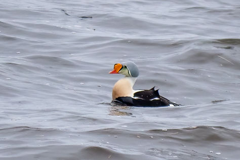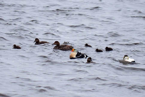 King Eiders usually migrate past the St. Lawrence River without stopping. This one settled down for about 2 weeks. He joined a family of Common Eider and spent some time trying to chase the Male away from the chicks.